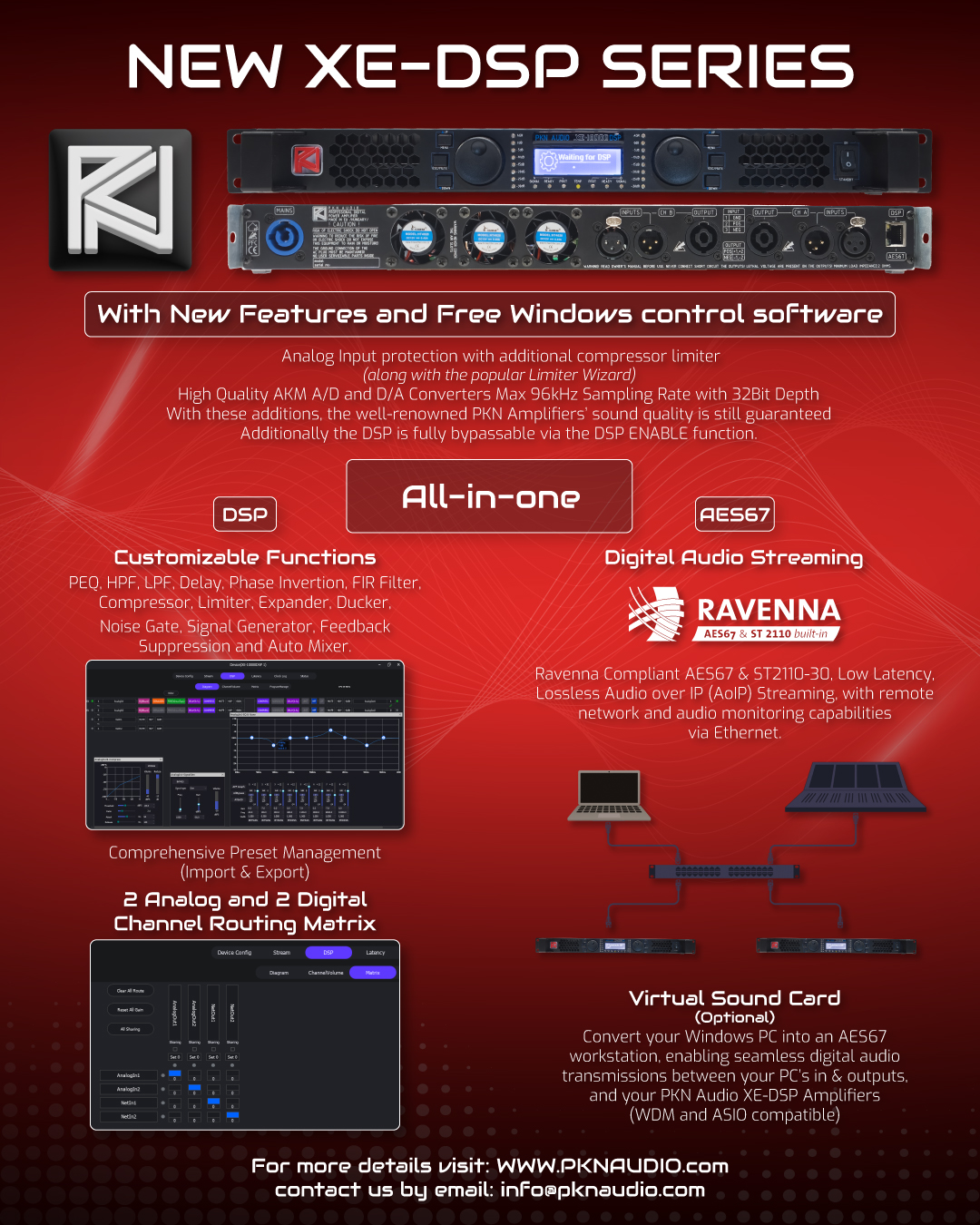 Description XE DSP Series professional amplifiers are designed for portable and fixed installations. Five models are available. Our newly developed Digital Signal Processing allows wide range of signal manipulation features, like filters (Bessel, BW, FIR) parametric EQ, delays, flexible matrtrix of signal routing. Top quality AD and DA interfacing assuring perfect signal integrity and high definition sound quality. Several sample rates are supported up to 96KS/s at 32bits resolution. Carefully designed analog domain frontends with latest converter technology are responsible for good signal integrity. Main Features - High output power and